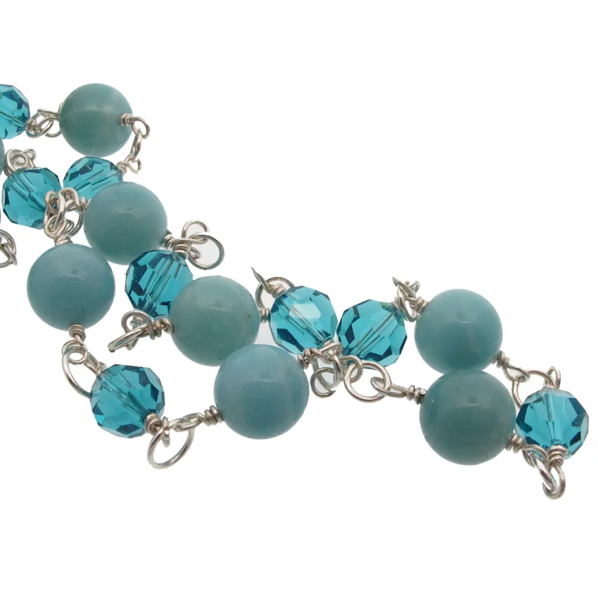 En härva av Amazonit rund ädelsten 6mm ljusblå och turkosa runda pärlor på blåa snören, arrangerade i lösa öglor mot en vit bakgrund.