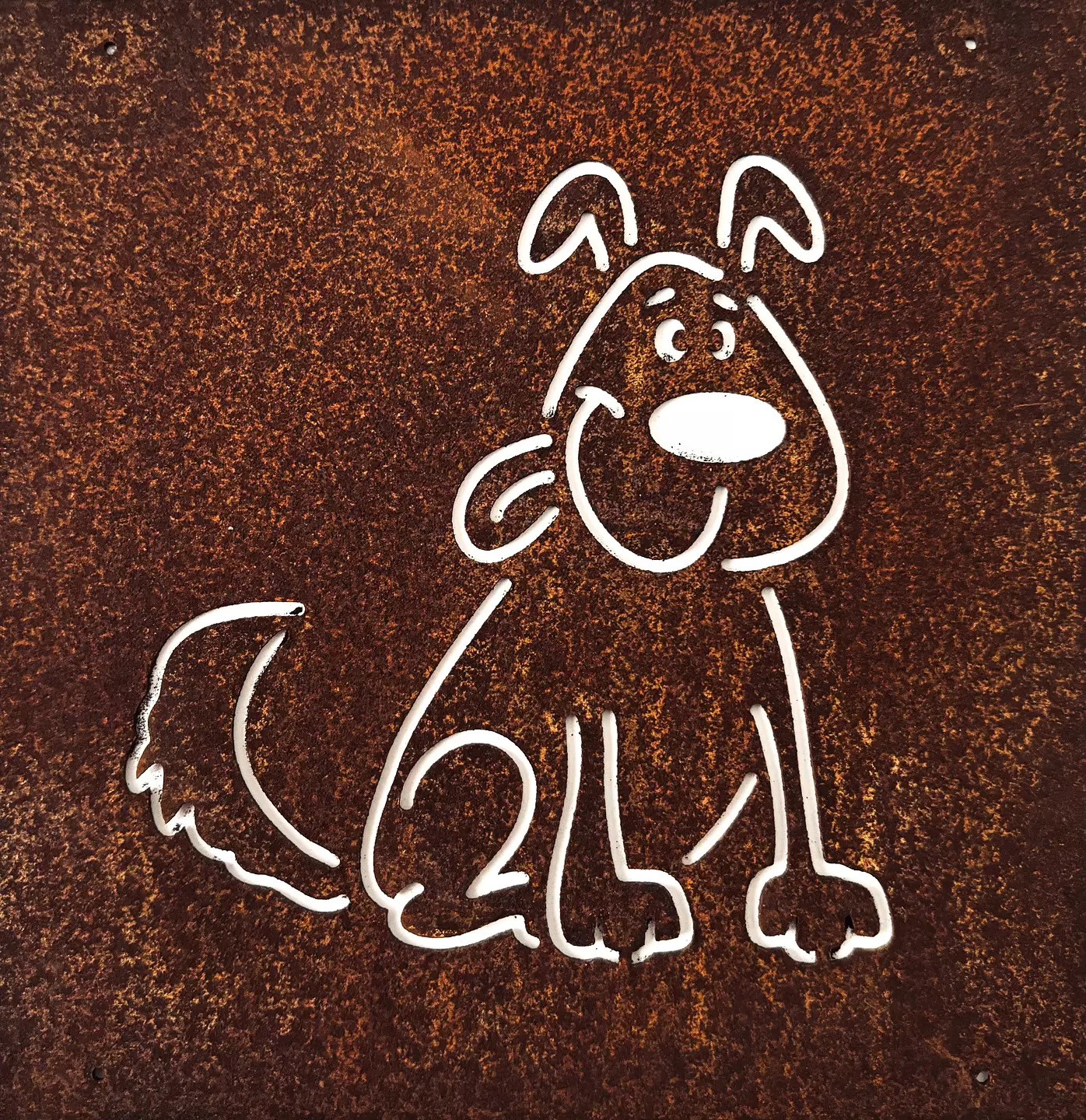Hund fin dekorplåt för armeringsnät 14x14cm, ståltråd till figuren medföljer så att den kan hängas i armeringsnät med storlek 15 cm rutor.