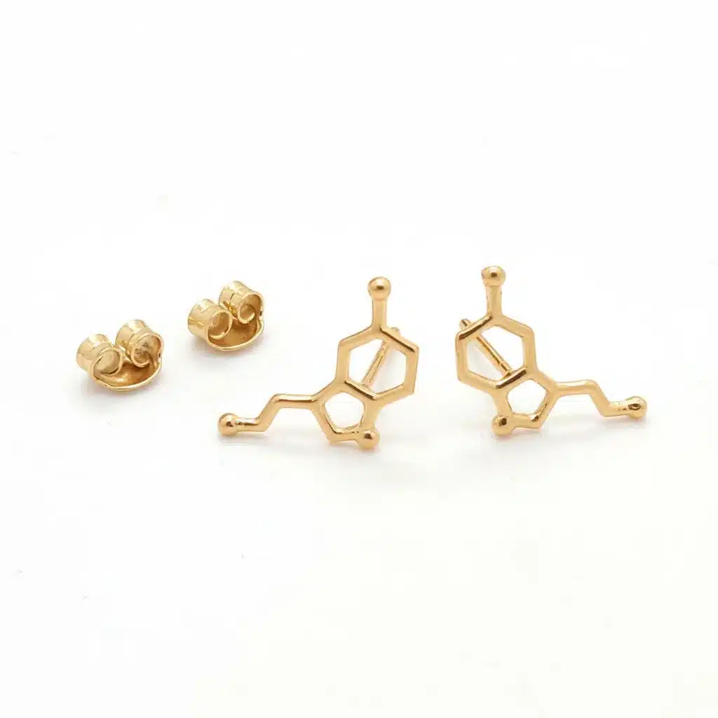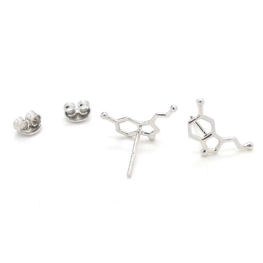 Örhänge med molekylen för Serotonin som är en signalsubstans som reglerar hungern och sömnen. Motverkar även oro och depression och bidrar till vårt välbefinnande. Örhänge som tillverkats i sterlingsilver och har två olika pläteringar.