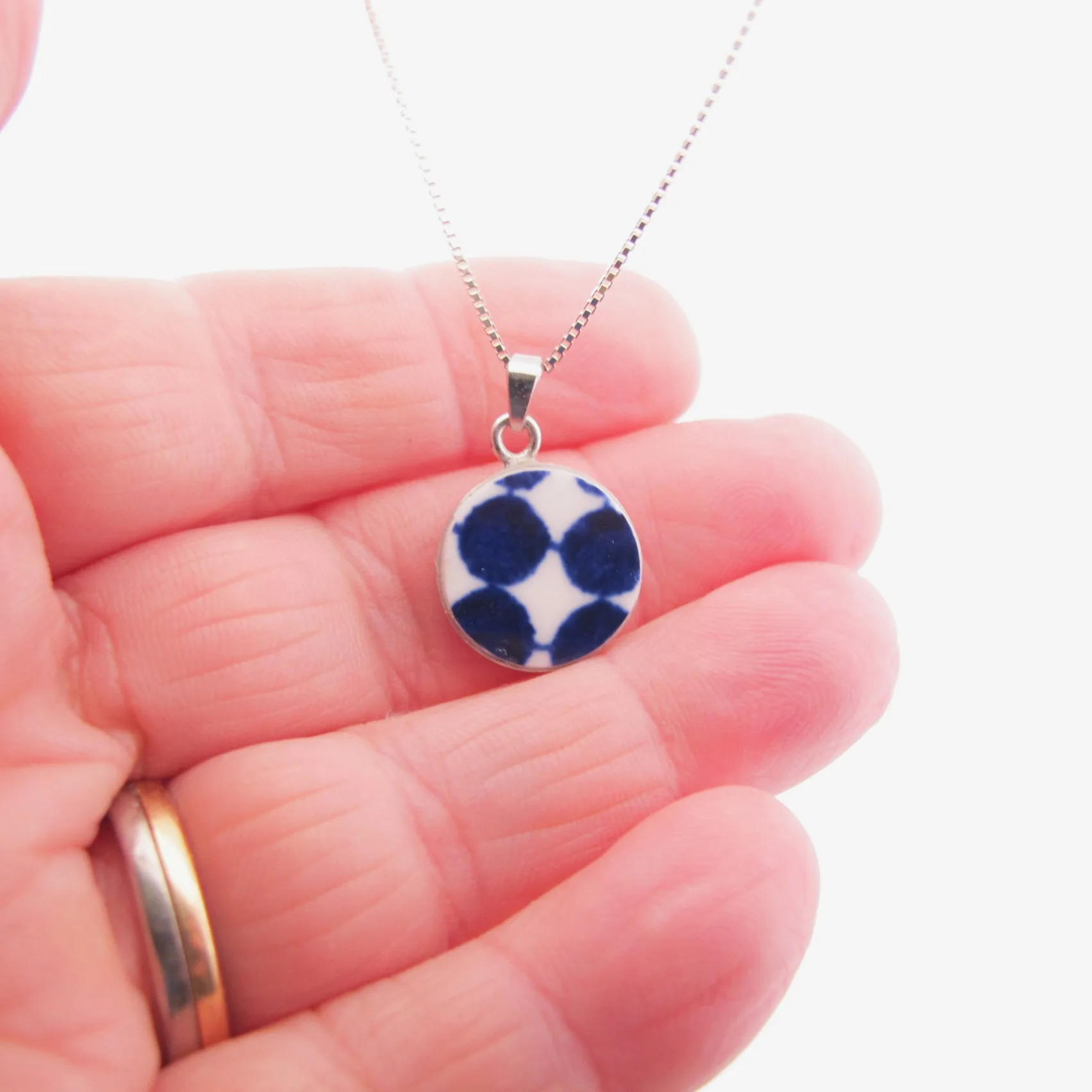 Hängsmycke som ingår i en kollektion av silversmycken som är tillverkad av återvunnet porslin och infattad i rodiumpläterat sterlingsilver. Vi tillverkat och slipar våra smycken av trasigt porslin från både kända och okända tillverkare smycket infattas i sterlingsilver. Porslinet visar åren av användning och vi har låtit charmen vara kvar efter år av användning.