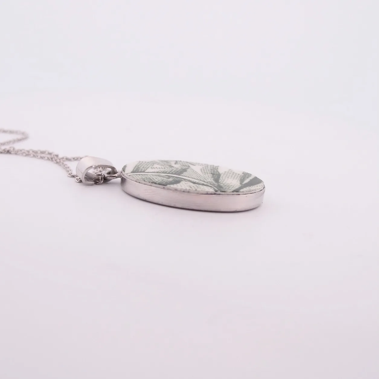 Porslinssmycke som ingår i en kollektion av silversmycken som är tillverkad av återvunnet porslin och infattad i rodiumpläterat sterlingsilver. Vi tillverkat och slipar våra smycken av trasigt porslin från både kända och okända tillverkare smycket infattas i sterlingsilver. Porslinet visar åren av användning och vi har låtit charmen vara kvar efter år av användning.